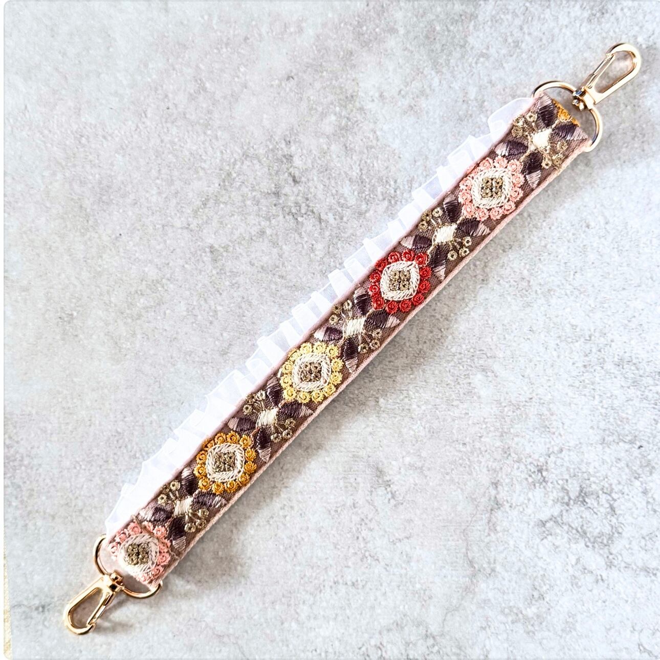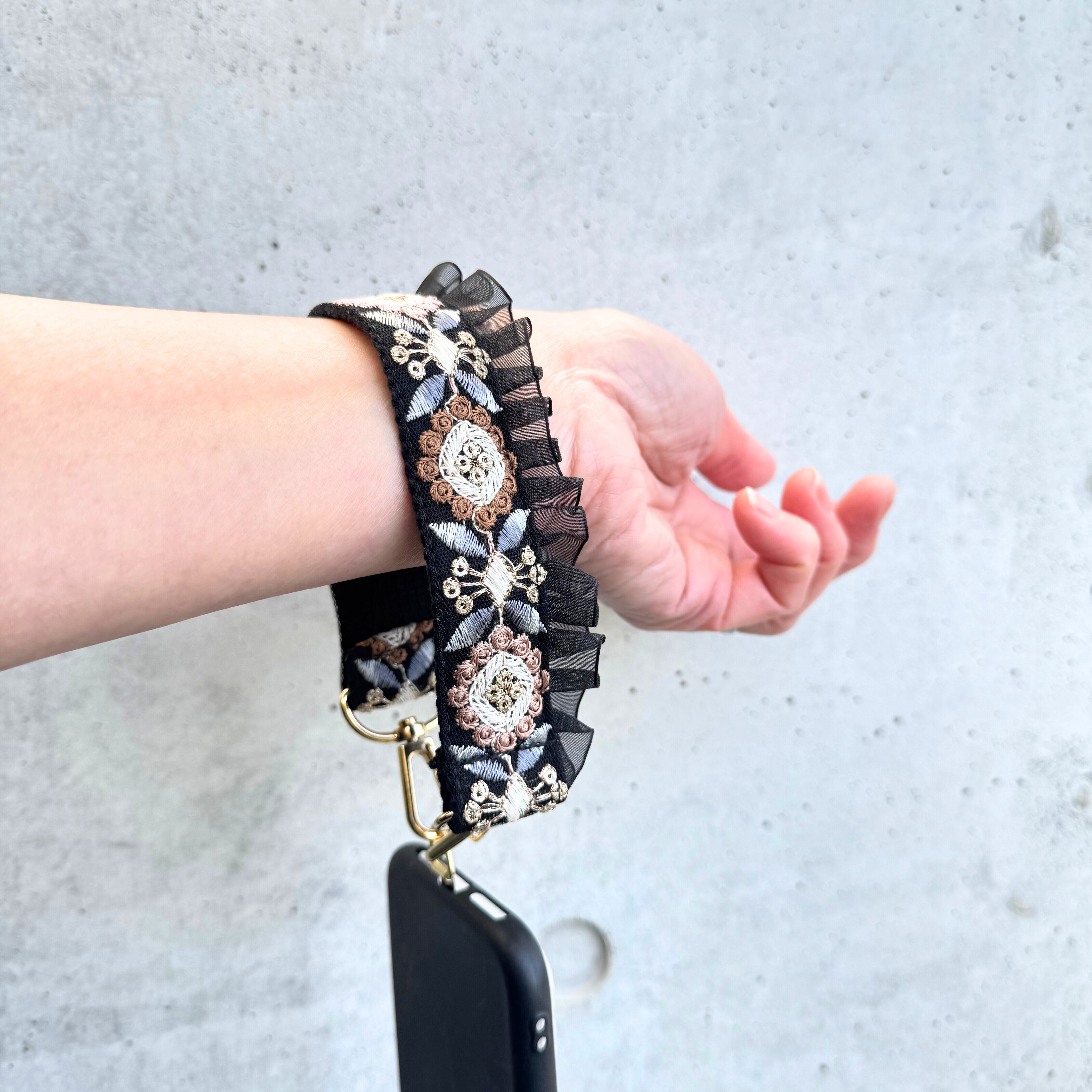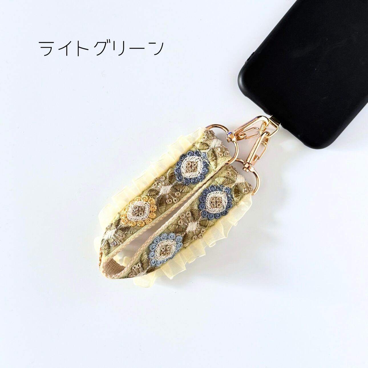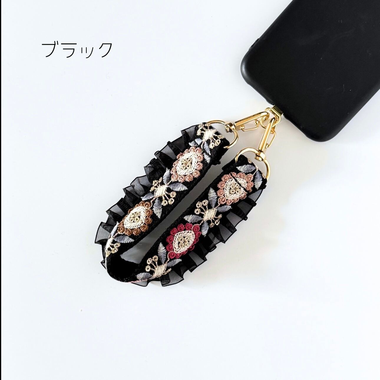 インド刺繍リボン ハンドストラップ スマホストラップ ショートストラップ クロッシェフリル